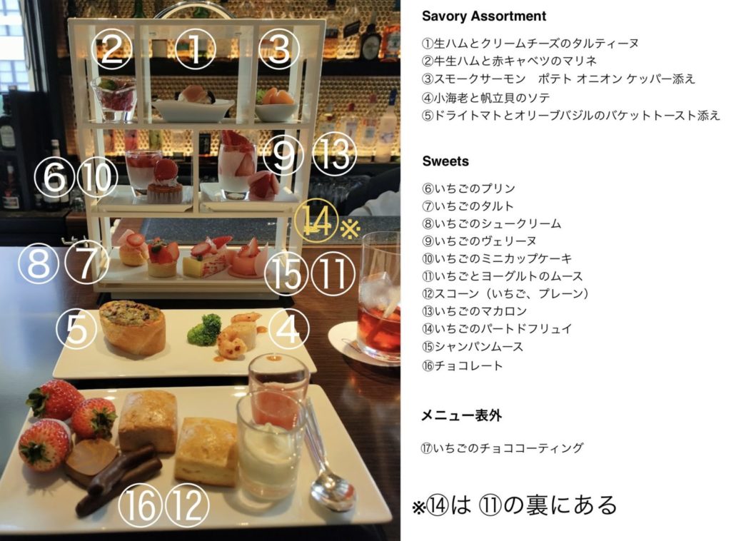 お腹を満たすセイボリー5品と、いちごをふんだんに使ったスイーツ12品が、美しいティースタンドで提供されます。